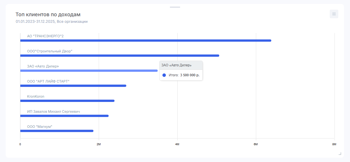 Виджет «Топ клиентов по доходам» в Аспро.Финансы поможет понять, нет ли зависимости от одного контрагента